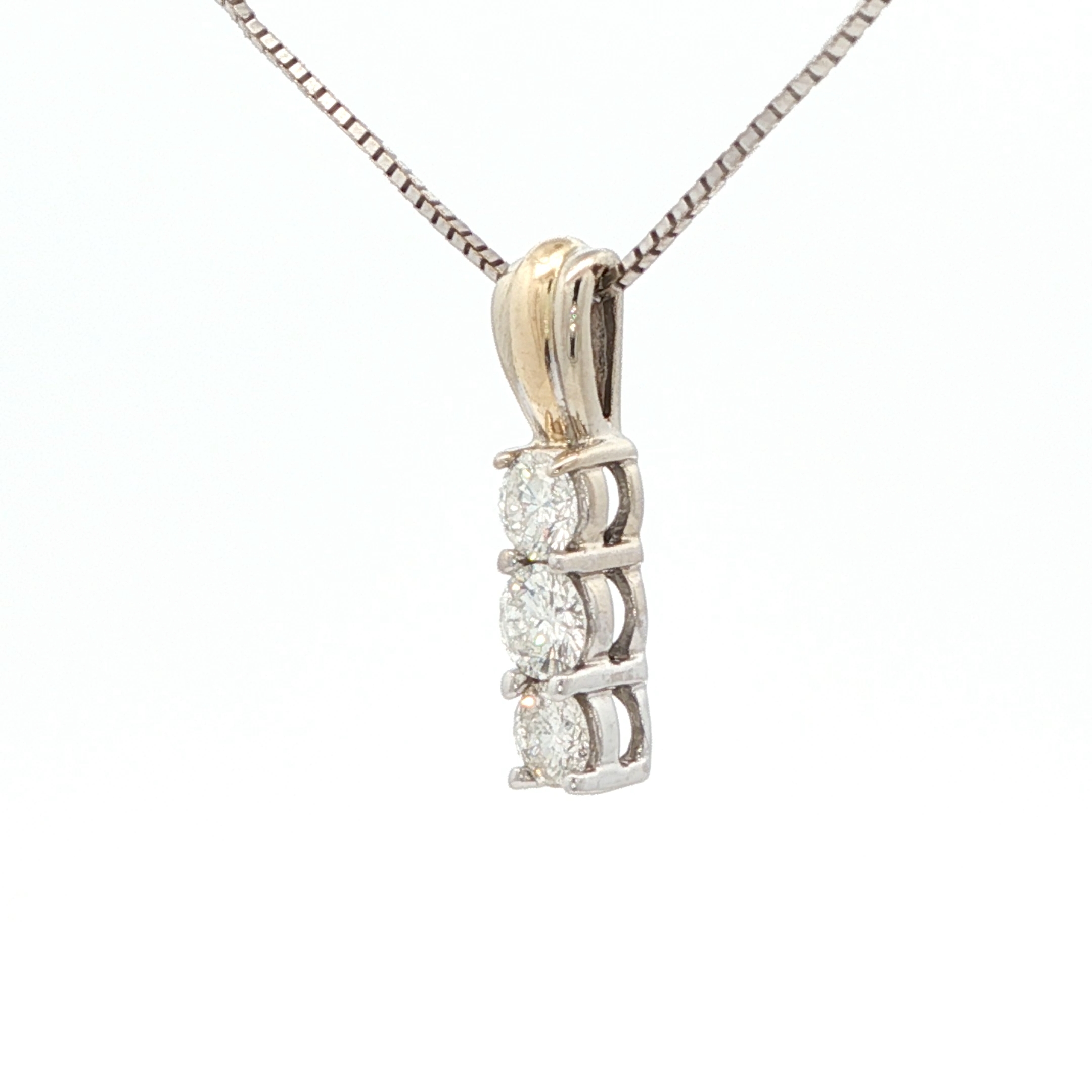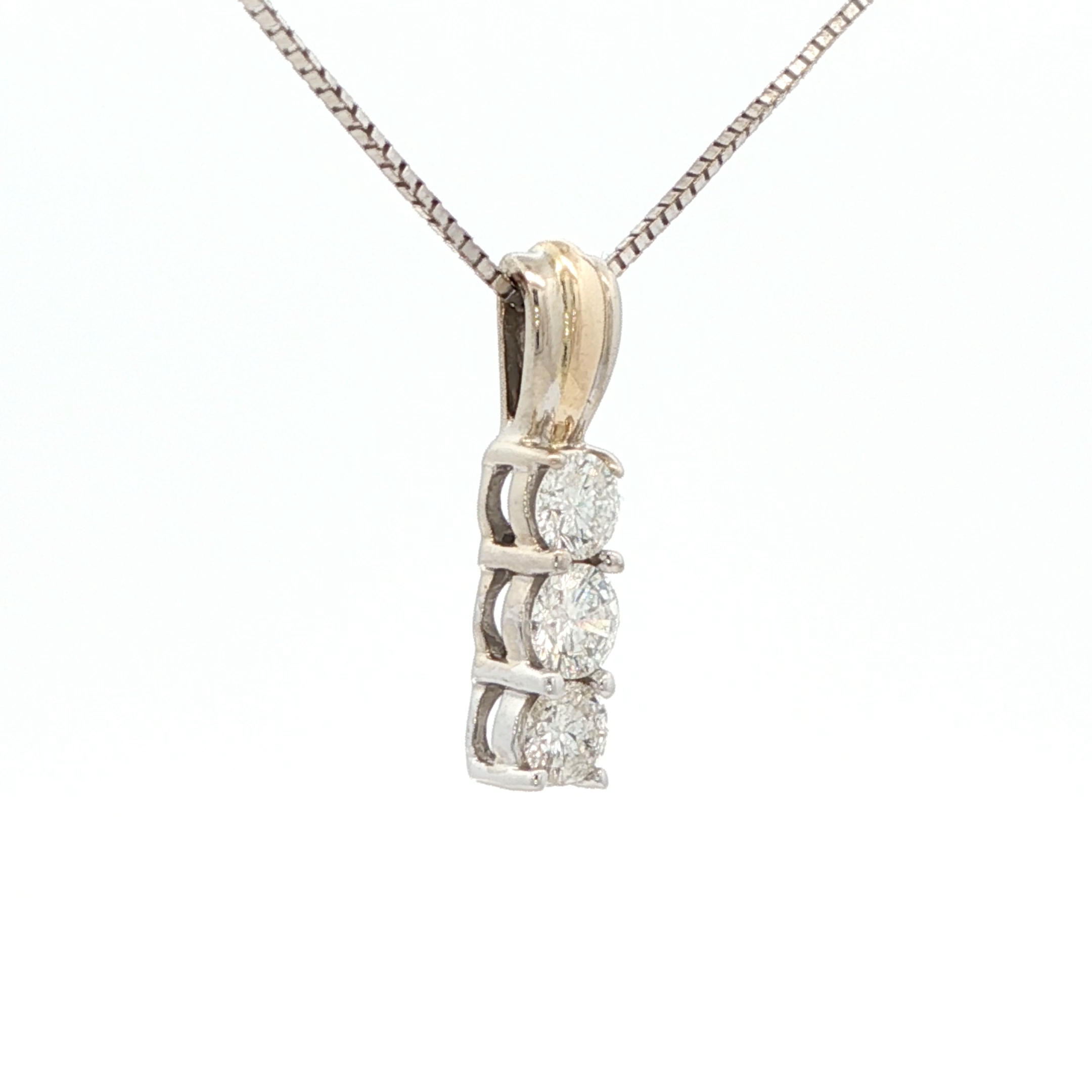 Elevate your style with this exquisite diamond necklace, featuring a trio of round brilliant cut diamonds suspended gracefully from a lustrous two-tone gold setting. A timeless and elegant piece, perfect for adding a touch of sparkle to any ensemble. The diamonds are set in a vertical row, creating a sleek and modern look.