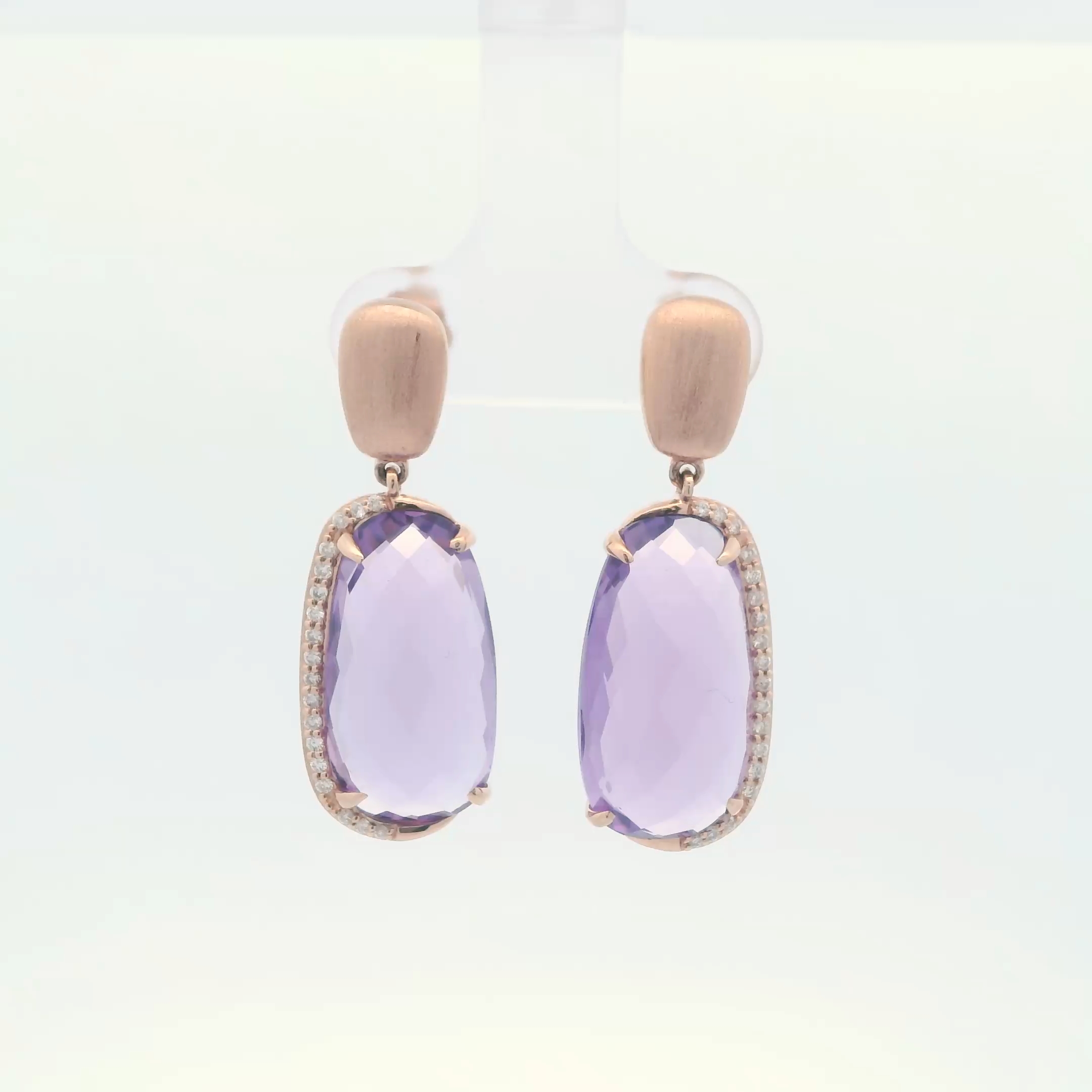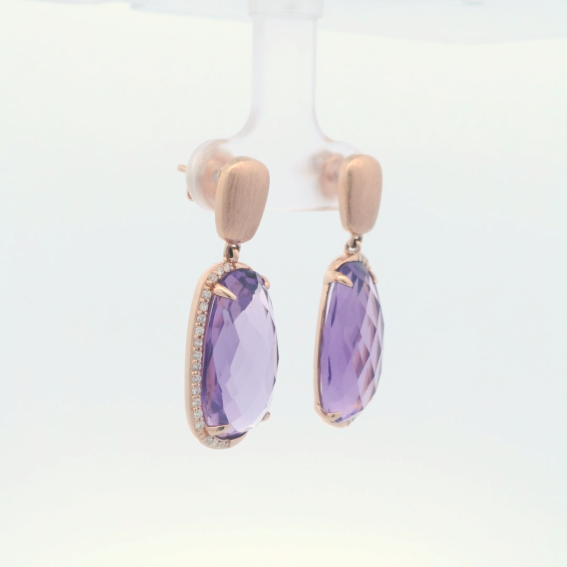Elevate your ensemble with these exquisite dangle earrings. Crafted in lustrous rose gold, they showcase large amethyst gemstones with a mixed cutting style. The vibrant purple hue and captivating design make these earrings a statement of refined elegance.