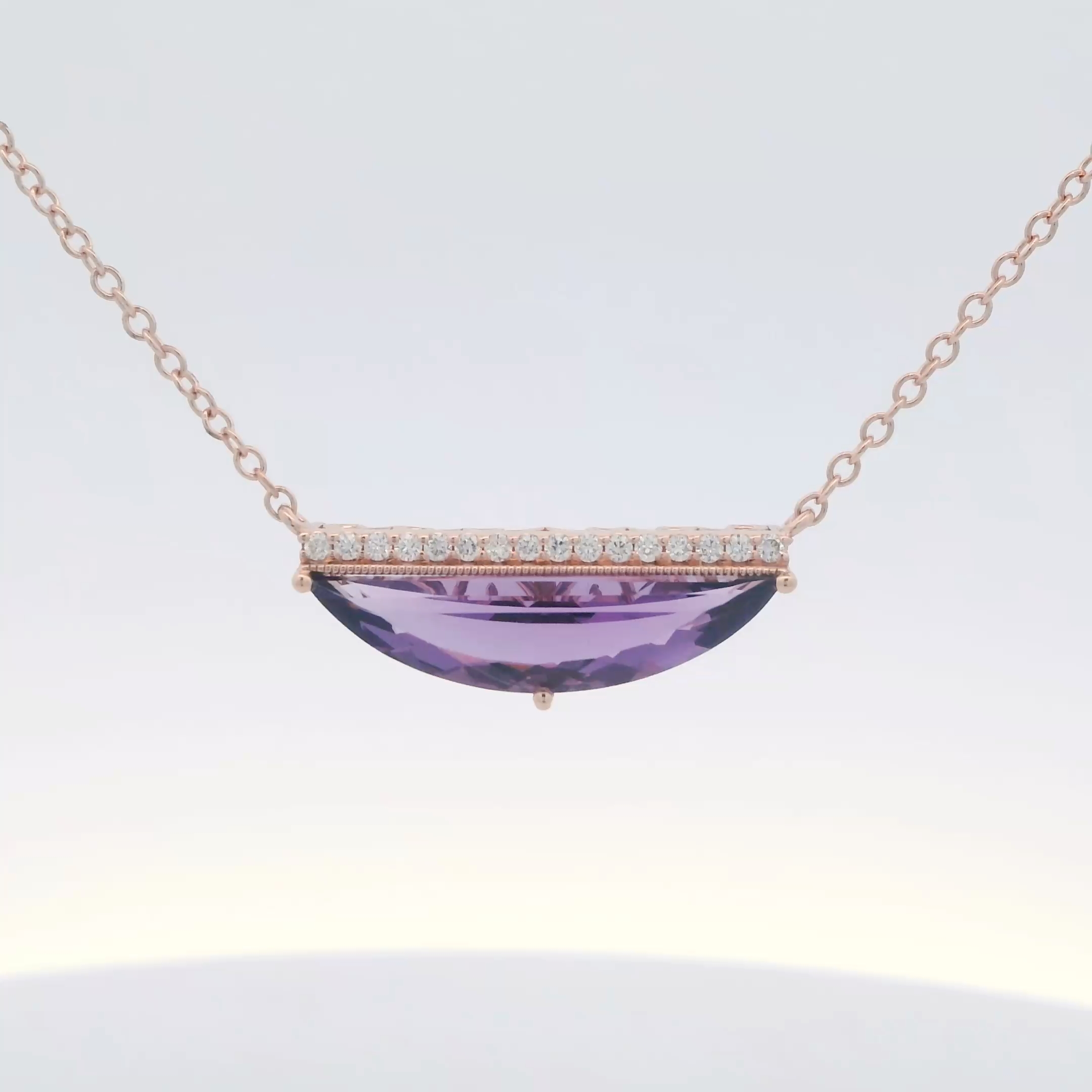 Exquisite rose gold chain necklace featuring a captivating half-moon shaped amethyst pendant. The amethyst boasts a smooth cut and a rich purple hue, radiating elegance and sophistication. A perfect blend of modern design and classic gemstone charm, this necklace adds a touch of regal allure to any ensemble.