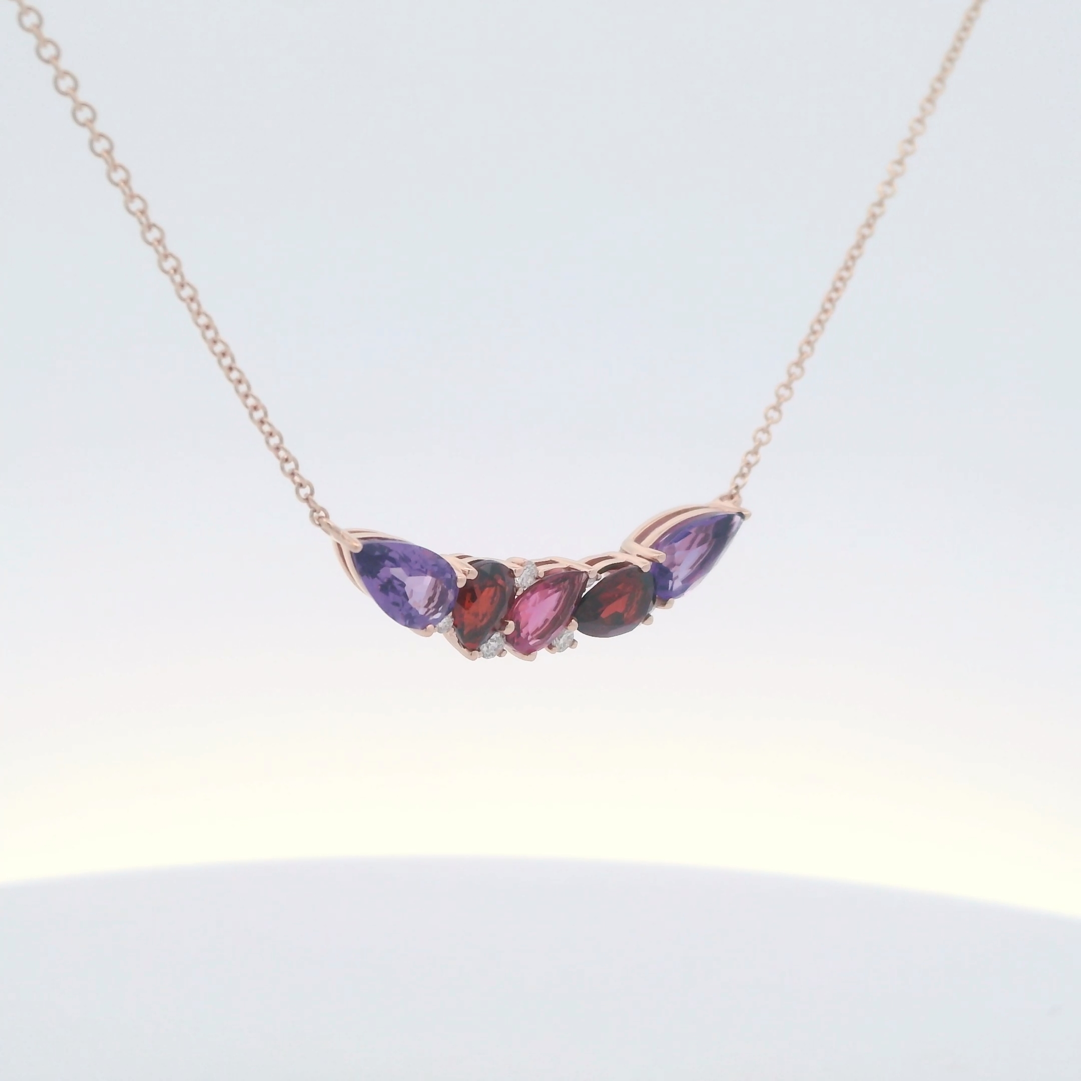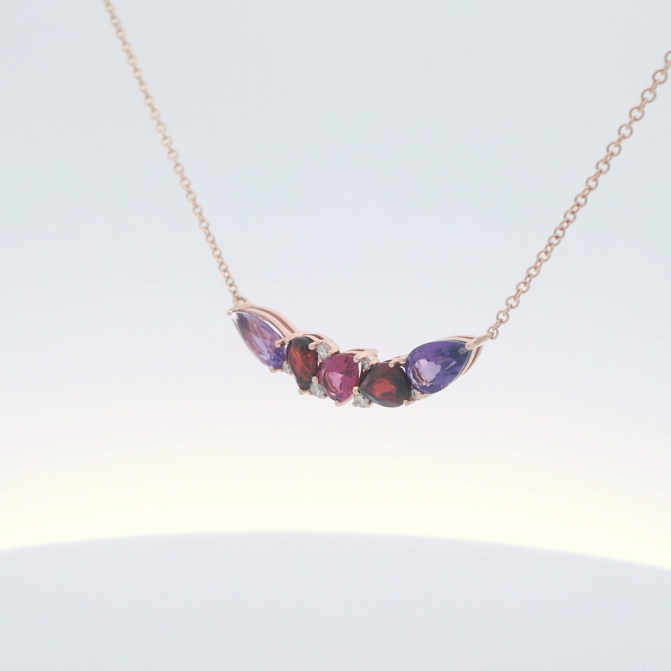 Elegantly crafted, this rose gold chain features a stunning arrangement of pear shaped amethysts, garnets, and pink tourmaline. The gems are carefully selected for their strong saturation, good polish, and symmetry. The chain is meticulously designed to showcase the unique allure of these hand selected gems, creating a timeless piece of sophisticated jewelry.