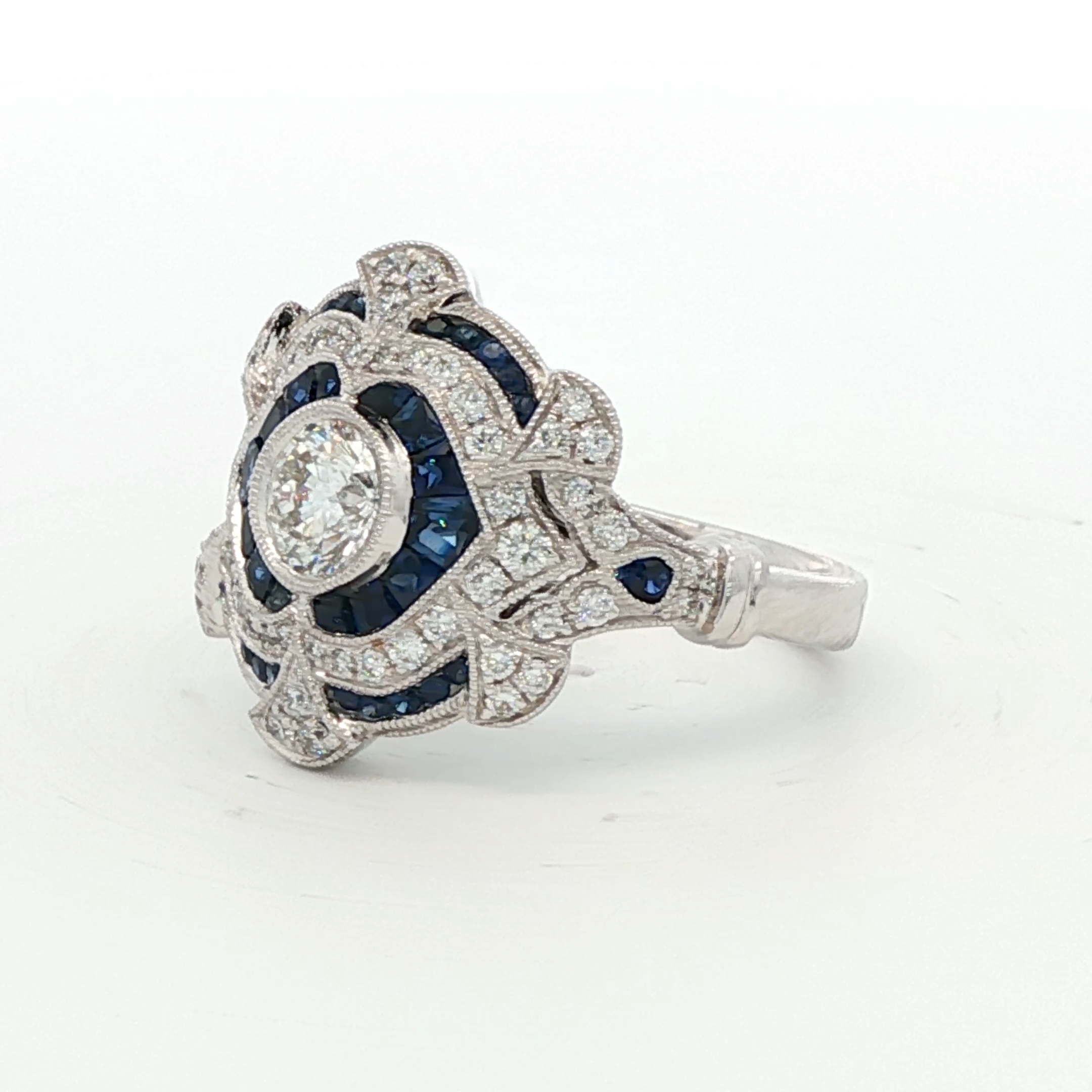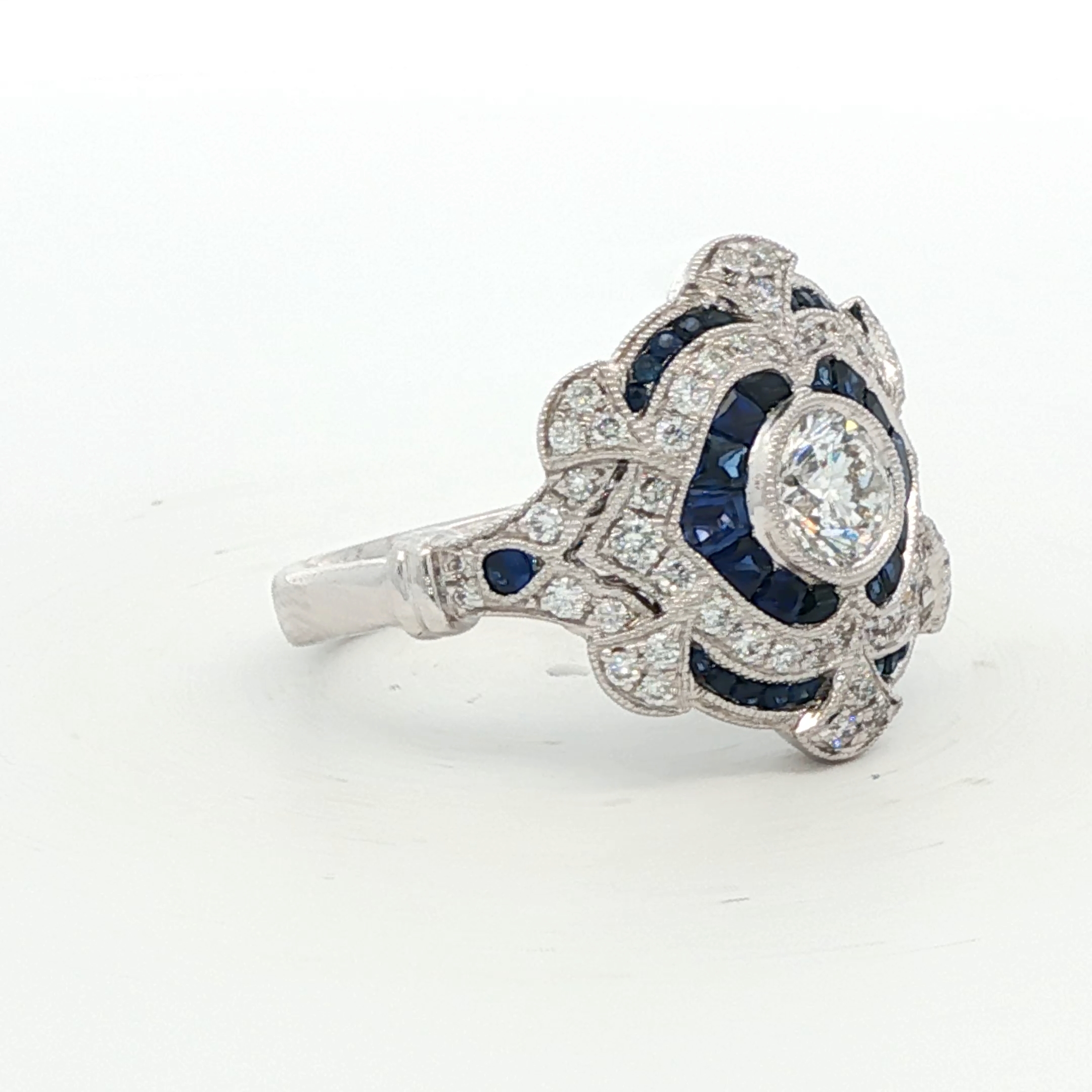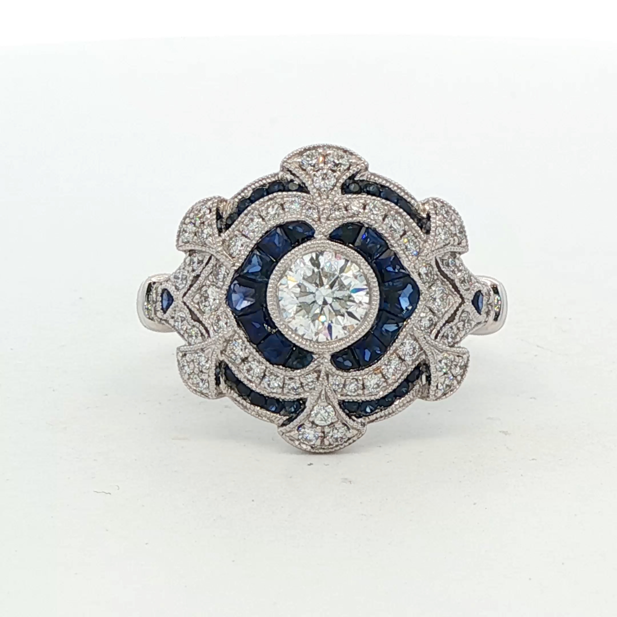 Exquisite Art Deco inspired ring in white gold. A central round brilliant cut diamond is framed by a geometric halo of blue sapphires. Elaborate milgrain-edged scrollwork and diamonds extend across the wide, scalloped openwork gallery, creating a sophisticated vintage-style arrangement with exceptional symmetry and polish.