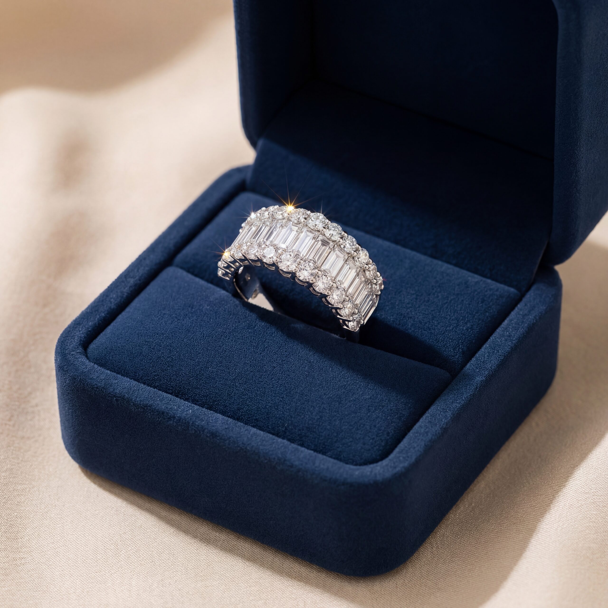 Exquisite white gold band showcasing a symphony of round brilliant cut and baguette diamonds. This stunning ring features a continuous row of meticulously set diamonds, symbolizing everlasting love and commitment. Its elegant design and superior craftsmanship make it a timeless addition to any fine jewelry collection.