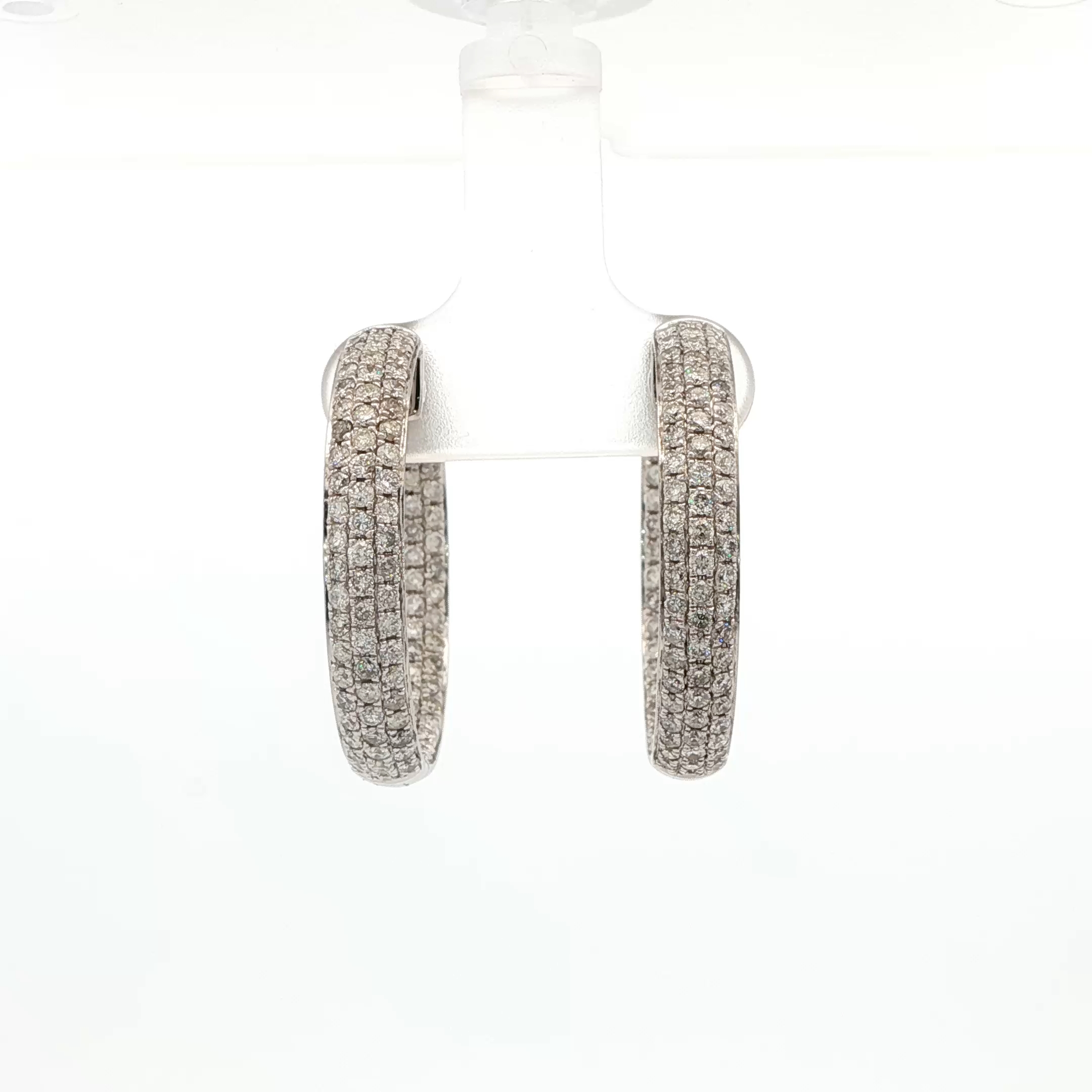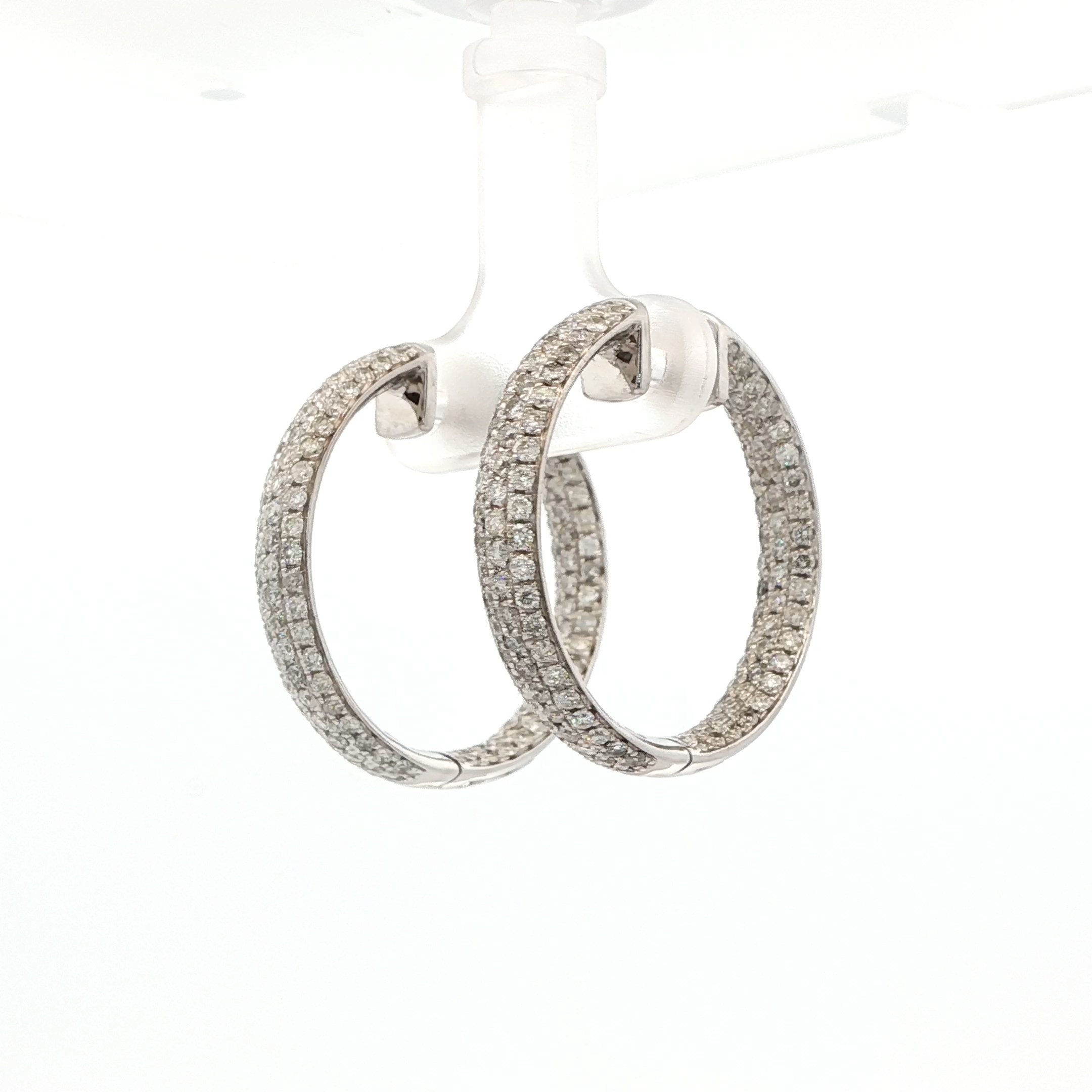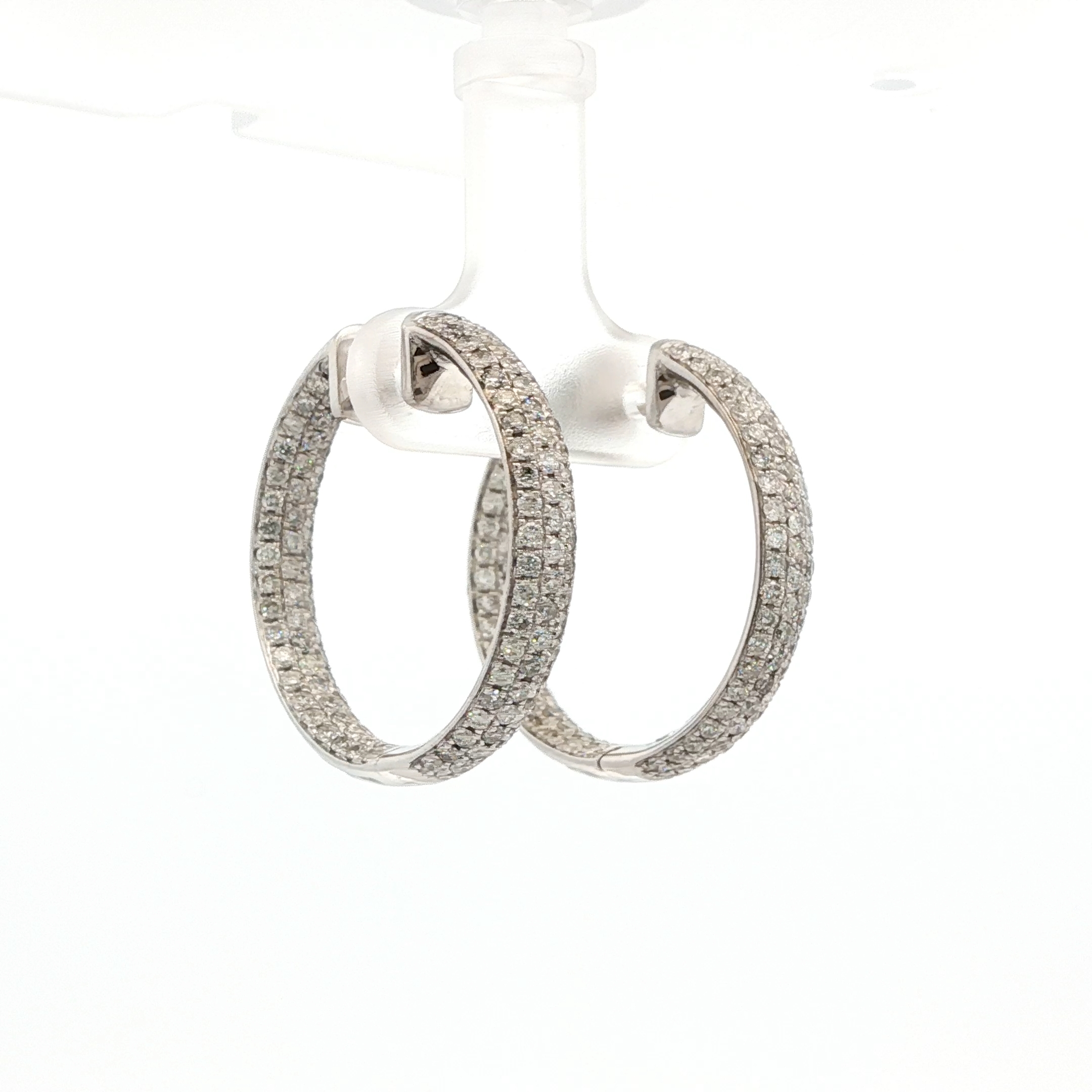 Elevate your style with these elegant hoop earrings, crafted in lustrous white gold. Each earring showcases round brilliant cut diamonds inside and outside the hoop, creating a dazzling display of light and fire. The timeless design and exceptional craftsmanship make these earrings a perfect addition to any jewelry collection.