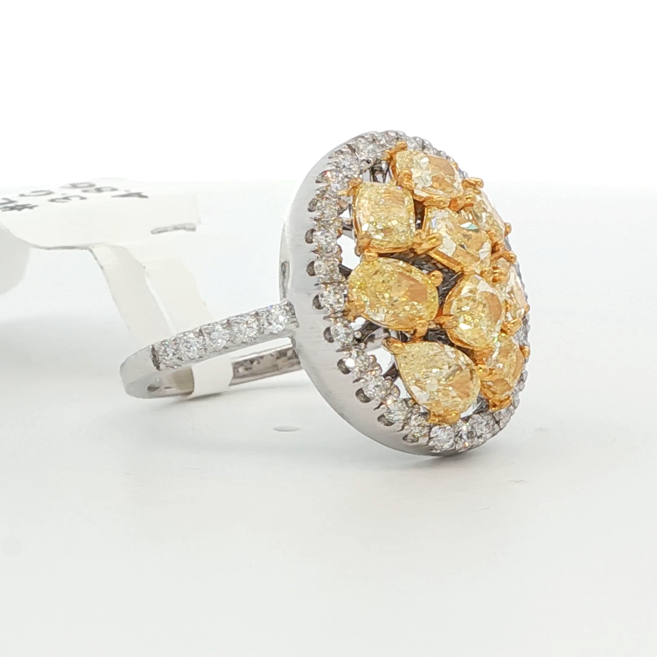 Indulge in the radiant allure of this beautiful cluster ring, expertly crafted in white gold. The centerpiece showcases a collection of fancy yellow diamonds, exhibiting brilliant mixed cutting styles. This ring is an embodiment of luxury and sophistication, ideal for making a statement.