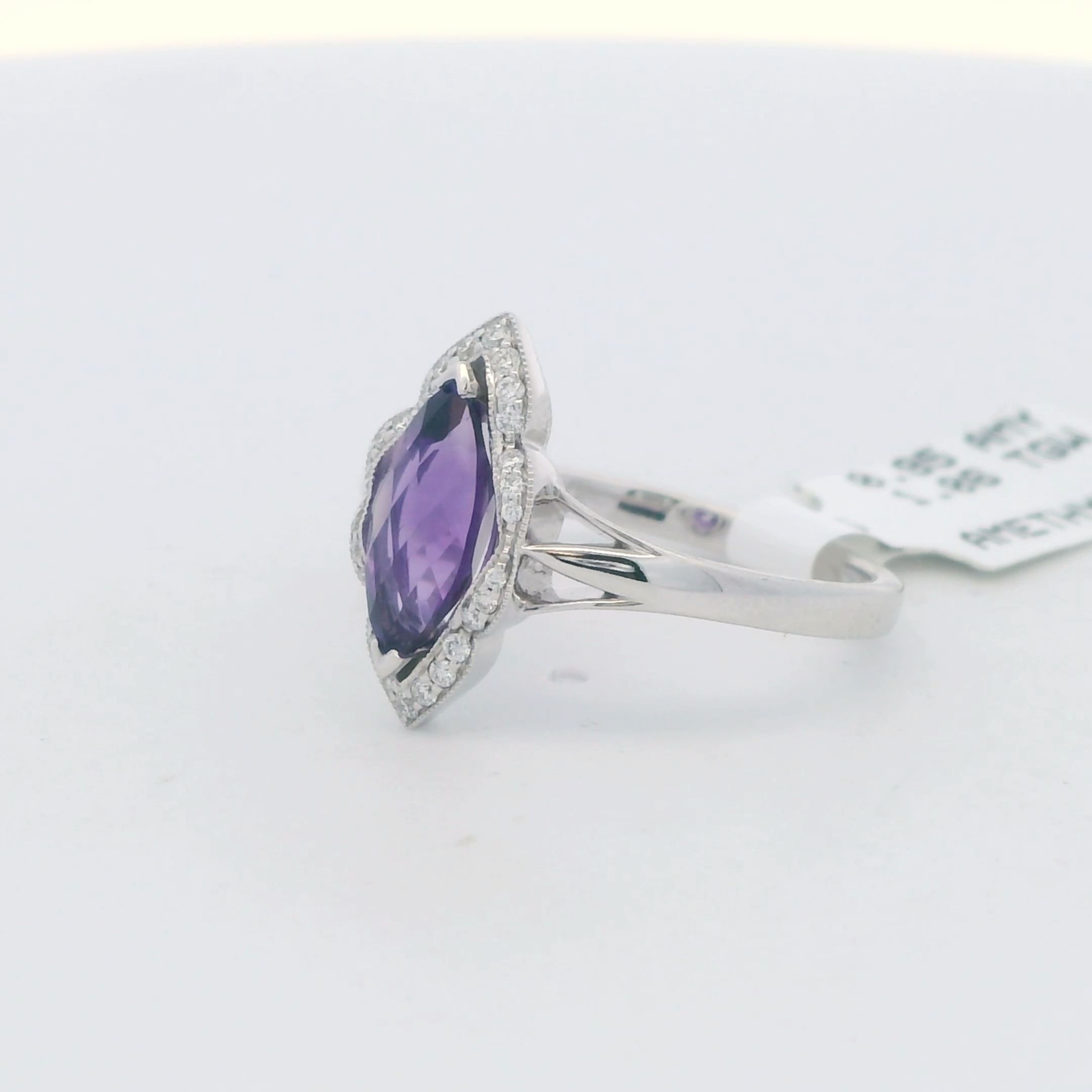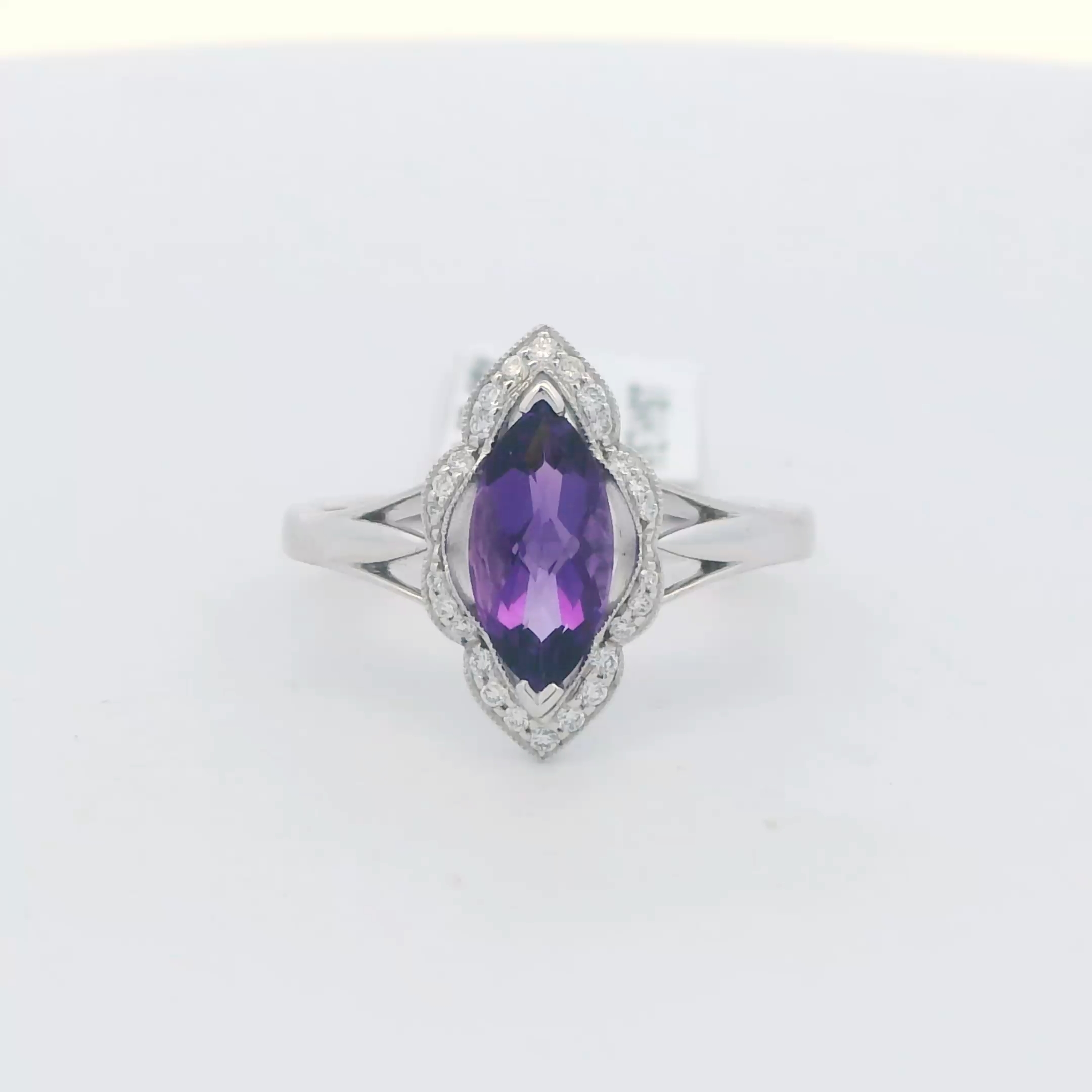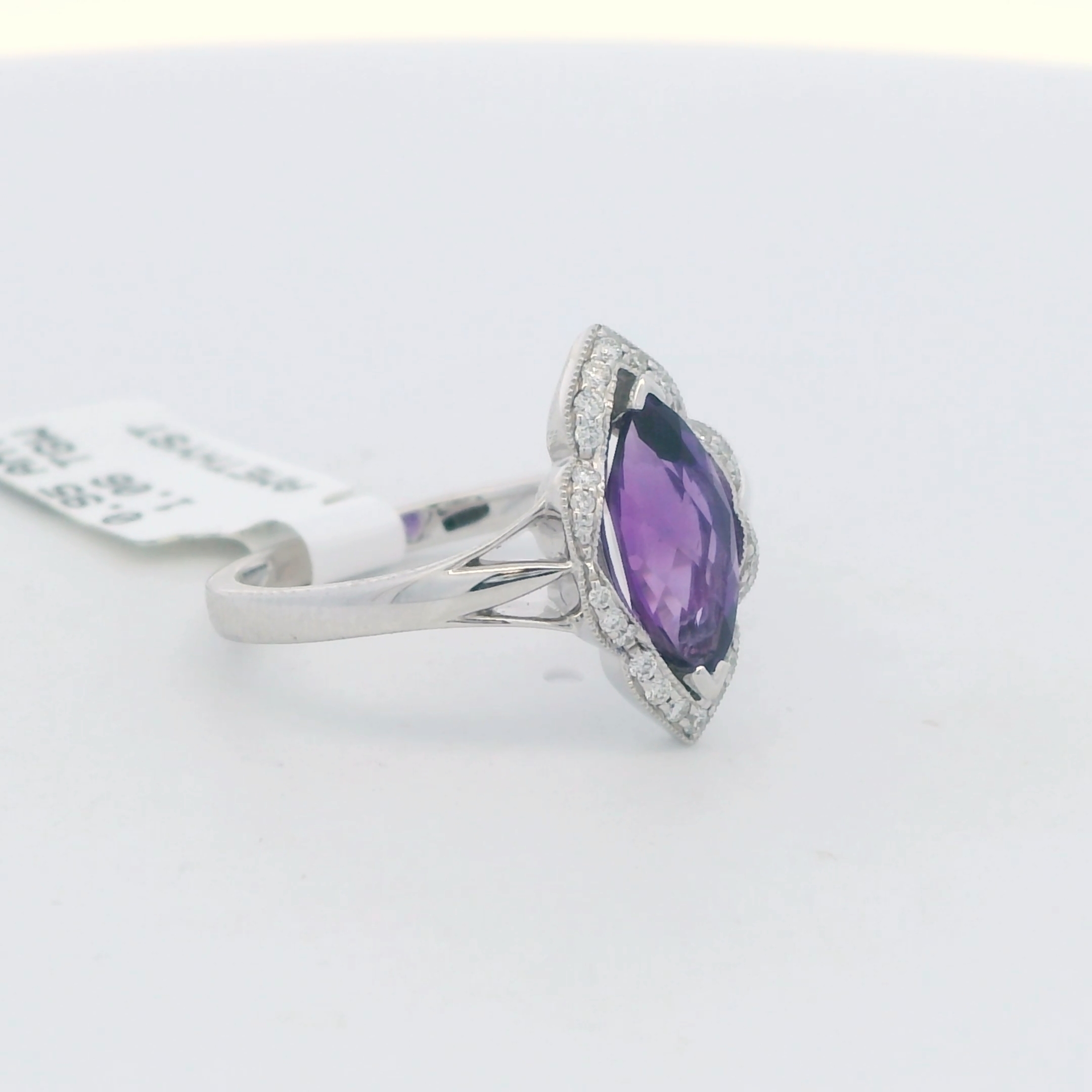Indulge in the allure of this exquisite cocktail ring, crafted in lustrous white gold. The focal point is a mesmerizing marquise-cut amethyst gemstone, celebrated for its rich purple hue and brilliant sparkle. This captivating ring embodies timeless elegance, perfect for making a bold statement.