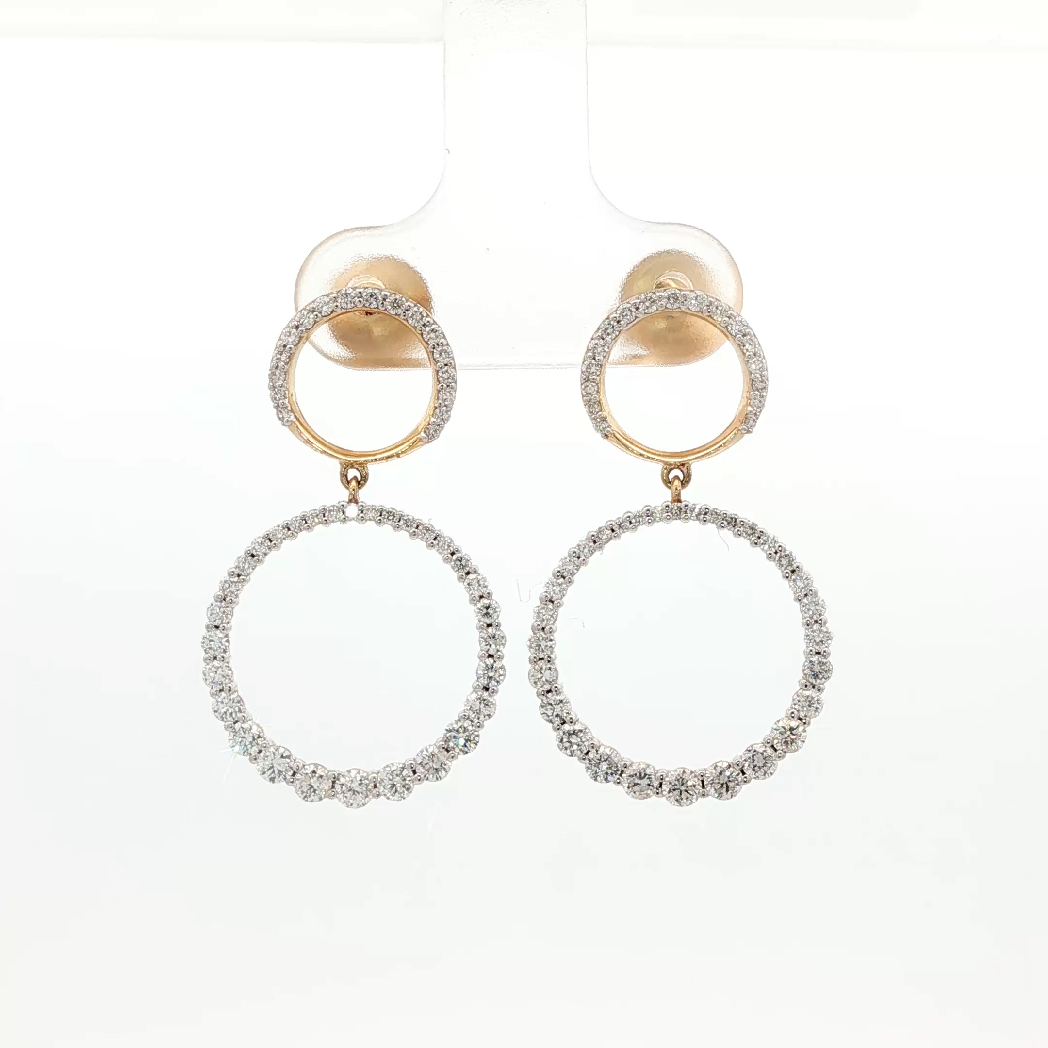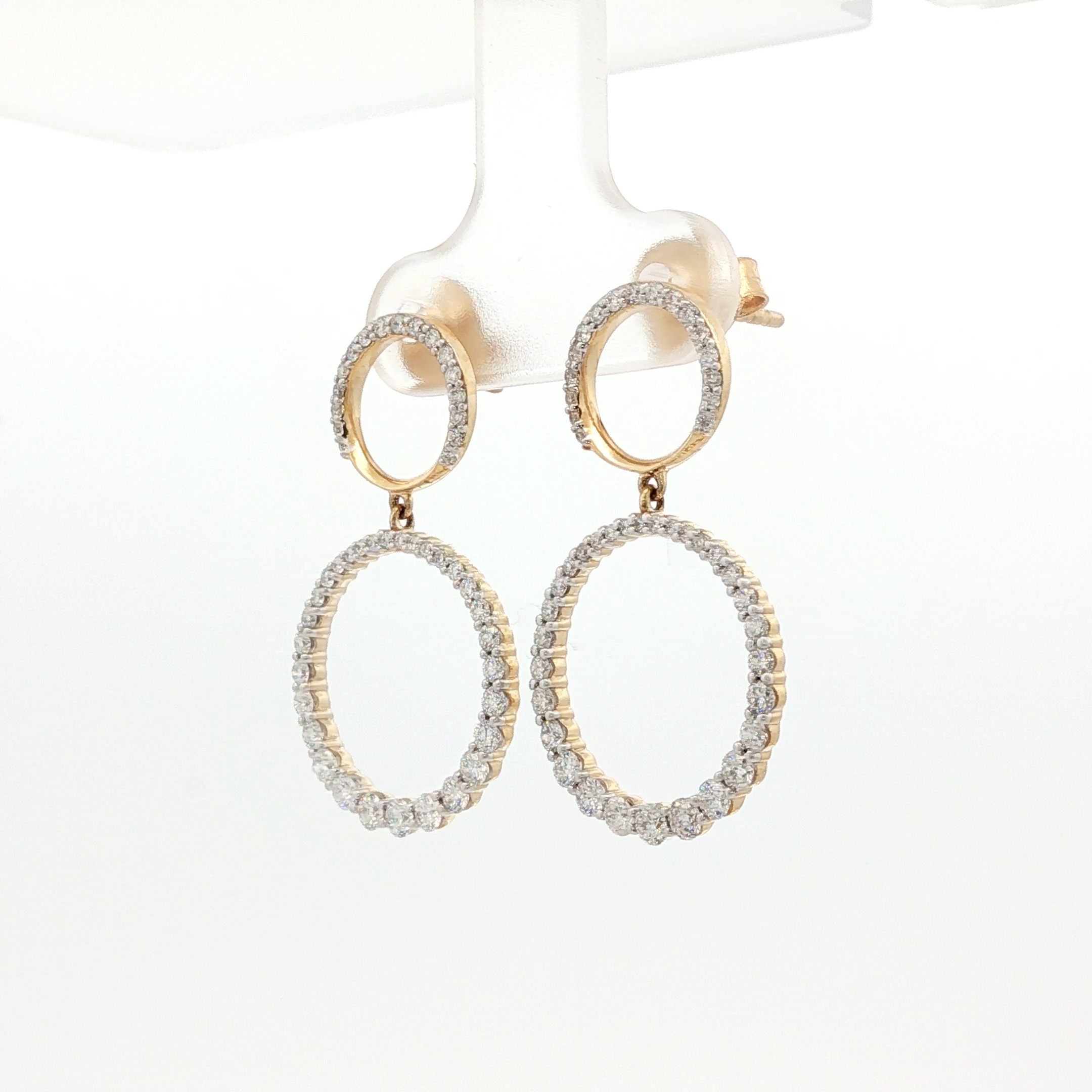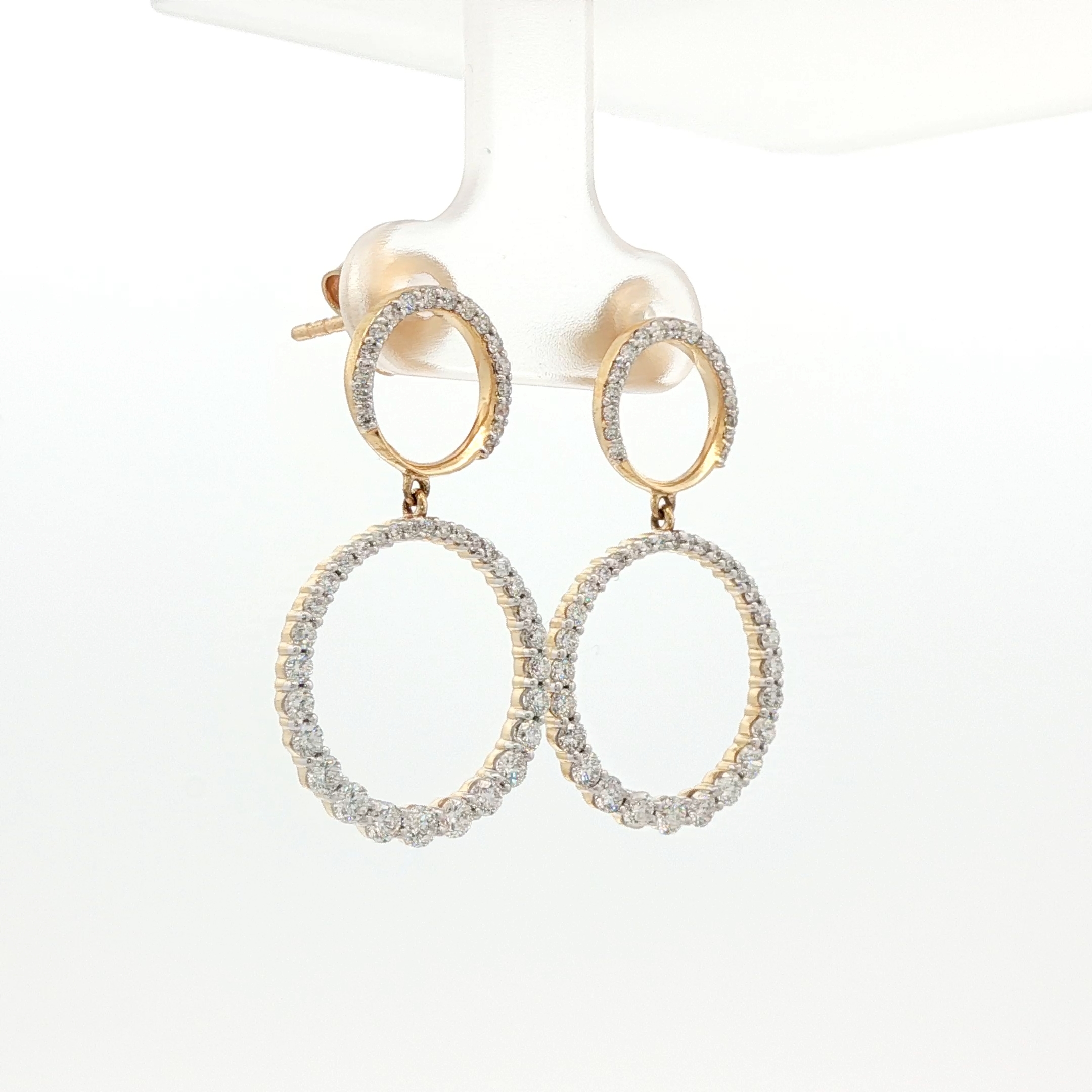 Elegant yellow gold drop earrings featuring a sophisticated linear arrangement. Each earring showcases a series of round brilliant cut diamonds, meticulously set to maximize light performance and brilliance. The design transitions from a classic stud to a delicate dangling ring, terminating in a striking diamond focal point. These earrings offer exceptional polish and symmetry, blending modern luxury with timeless sparkle, making them a perfect statement piece for any formal collection.