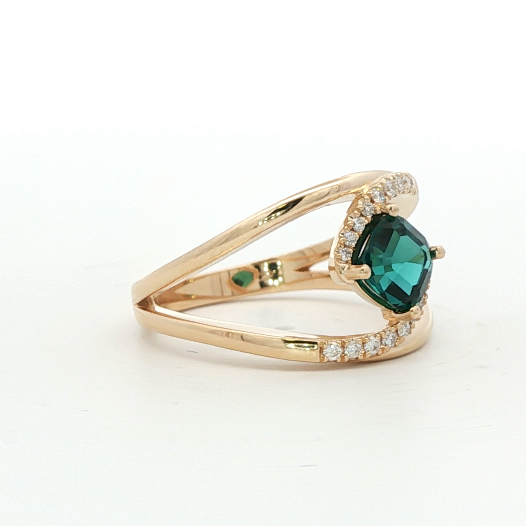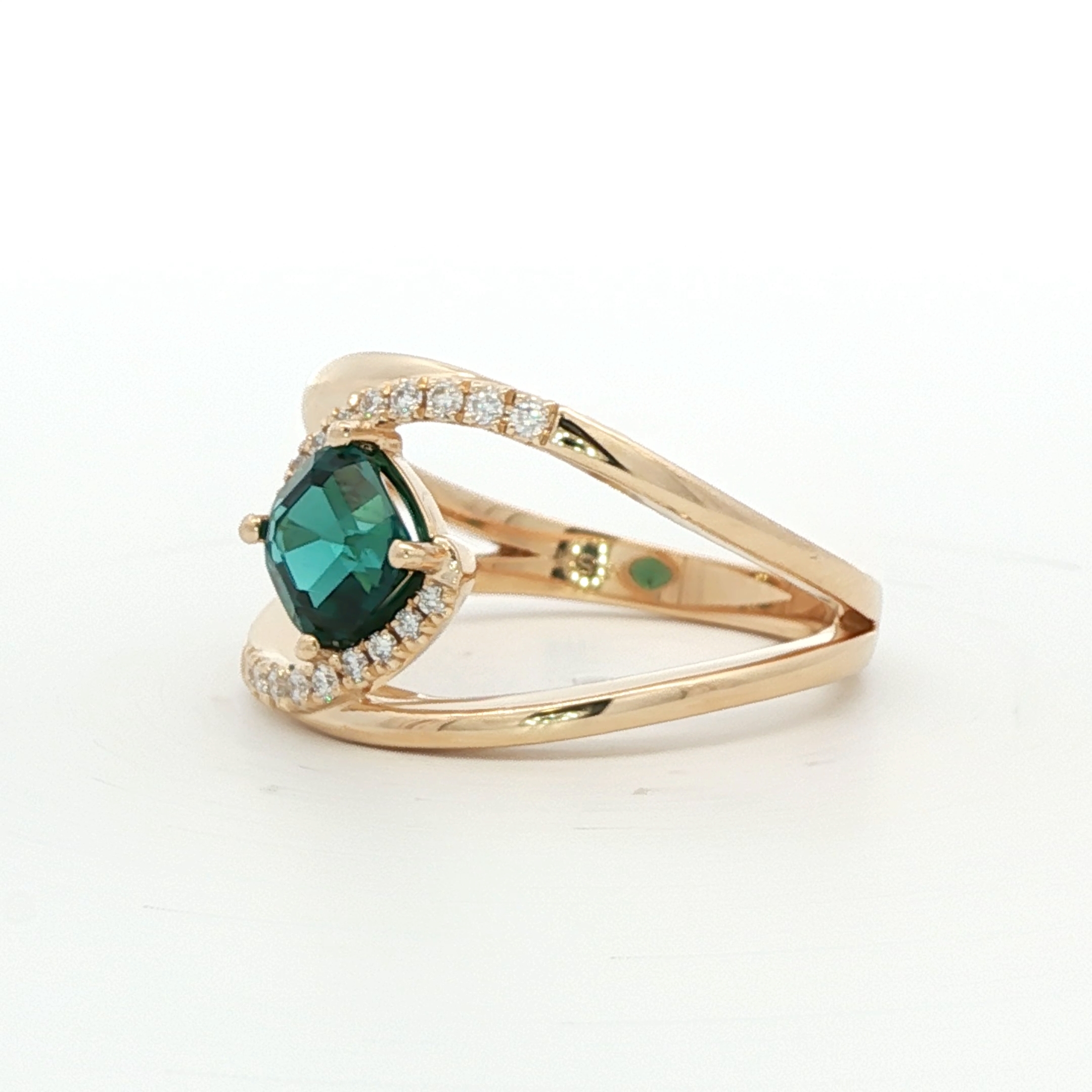 This elegant yellow gold ring features a central greenish-blue tourmaline in a unique setting. Two arced bands are set with brilliant round diamonds, gracefully swirling around the main gemstone to create a modern split-shank silhouette. The high-polish finish highlights the vibrant color and exceptional clarity of the tourmaline.