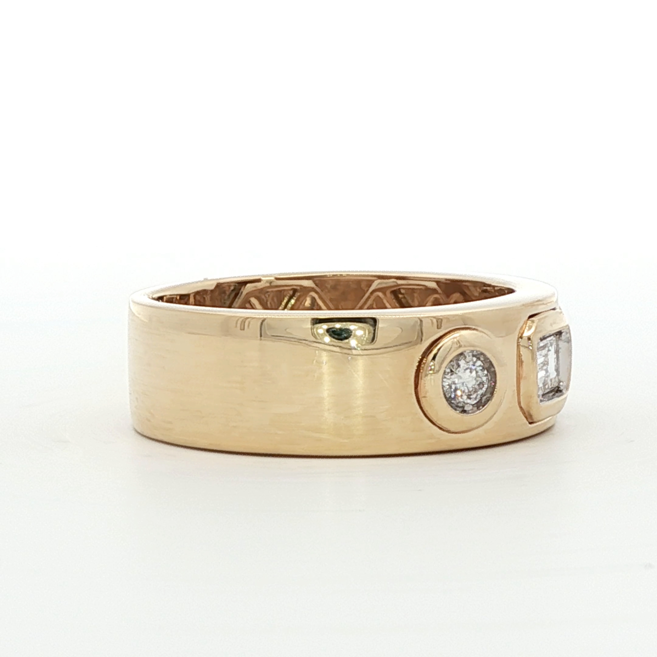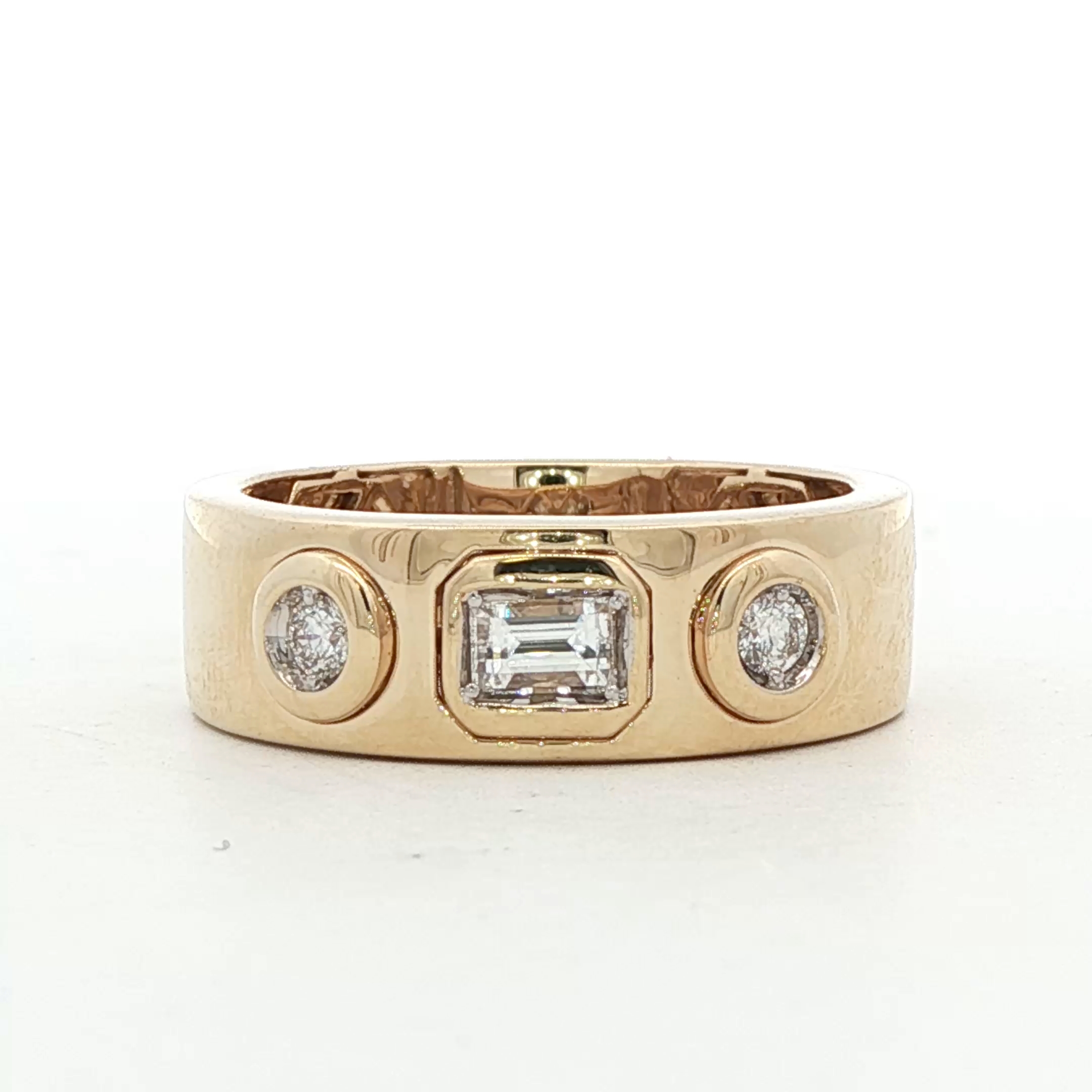 This sophisticated diamond ring is masterfully crafted in polished yellow gold, featuring a striking step cut diamond at its center. The central diamond showcases exceptional clarity and depth. Flanking the main stone is a beautiful pair of round brilliant diamond accents. This symmetric composition highlights a harmonious blend of geometric shapes, resulting in a timeless design with superior symmetry, polish, and a brilliant display of light.