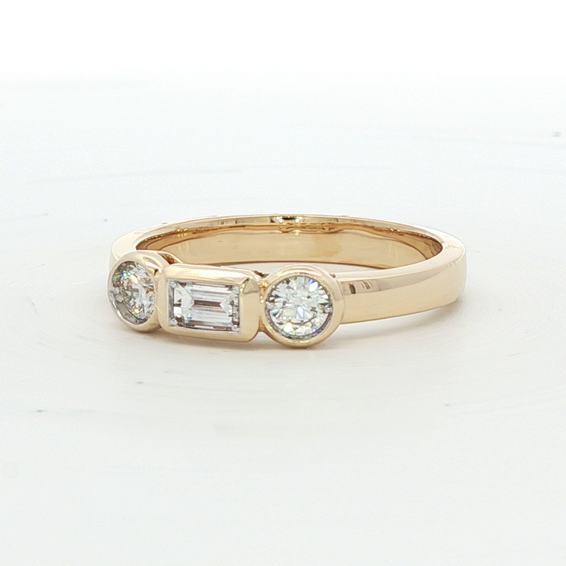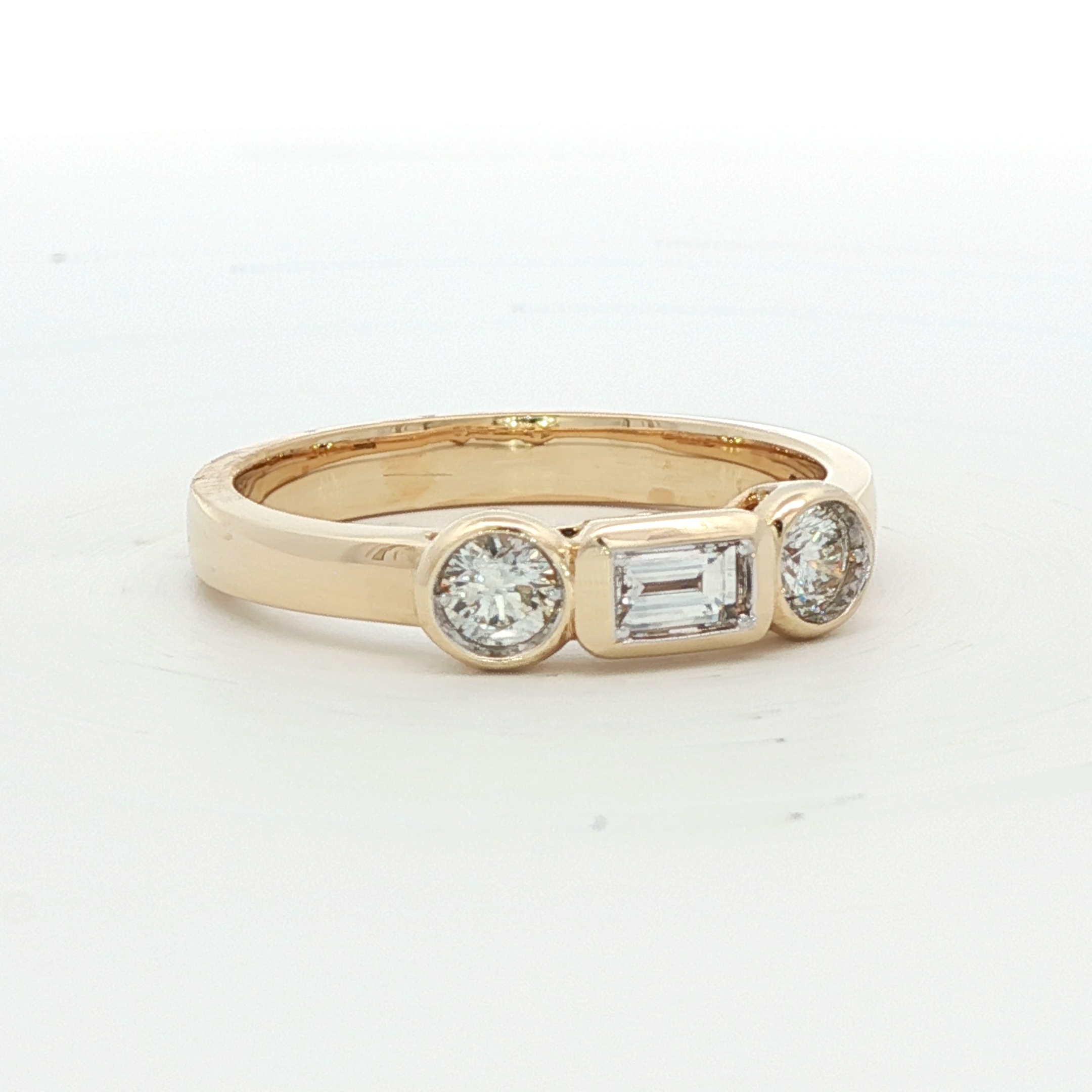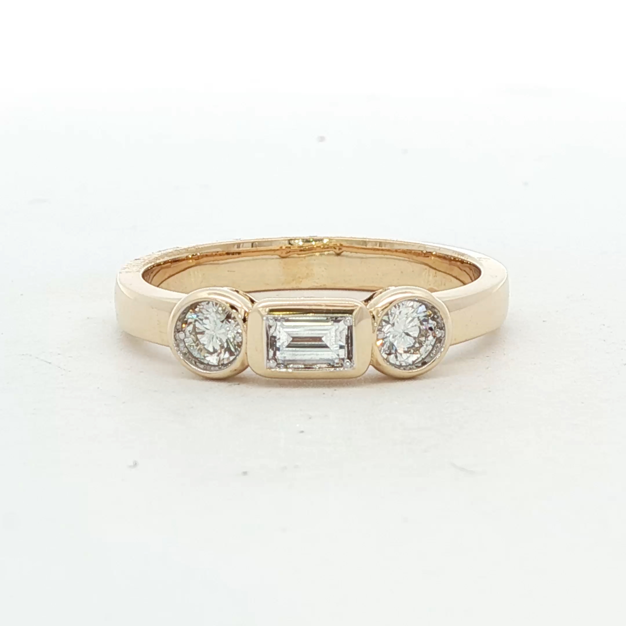 This sophisticated diamond ring is masterfully crafted in polished yellow gold, featuring a striking step cut diamond at its center. The central diamond showcases exceptional clarity and depth. Flanking the main stone is a beautiful pair of round brilliant diamond accents. This symmetric composition highlights a harmonious blend of geometric shapes, resulting in a timeless design with superior symmetry, polish, and a brilliant display of light.