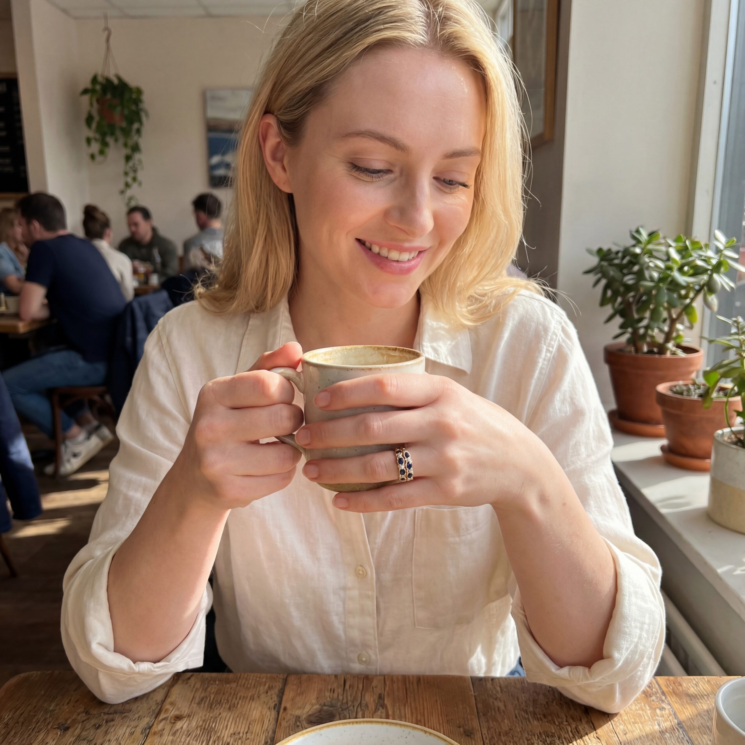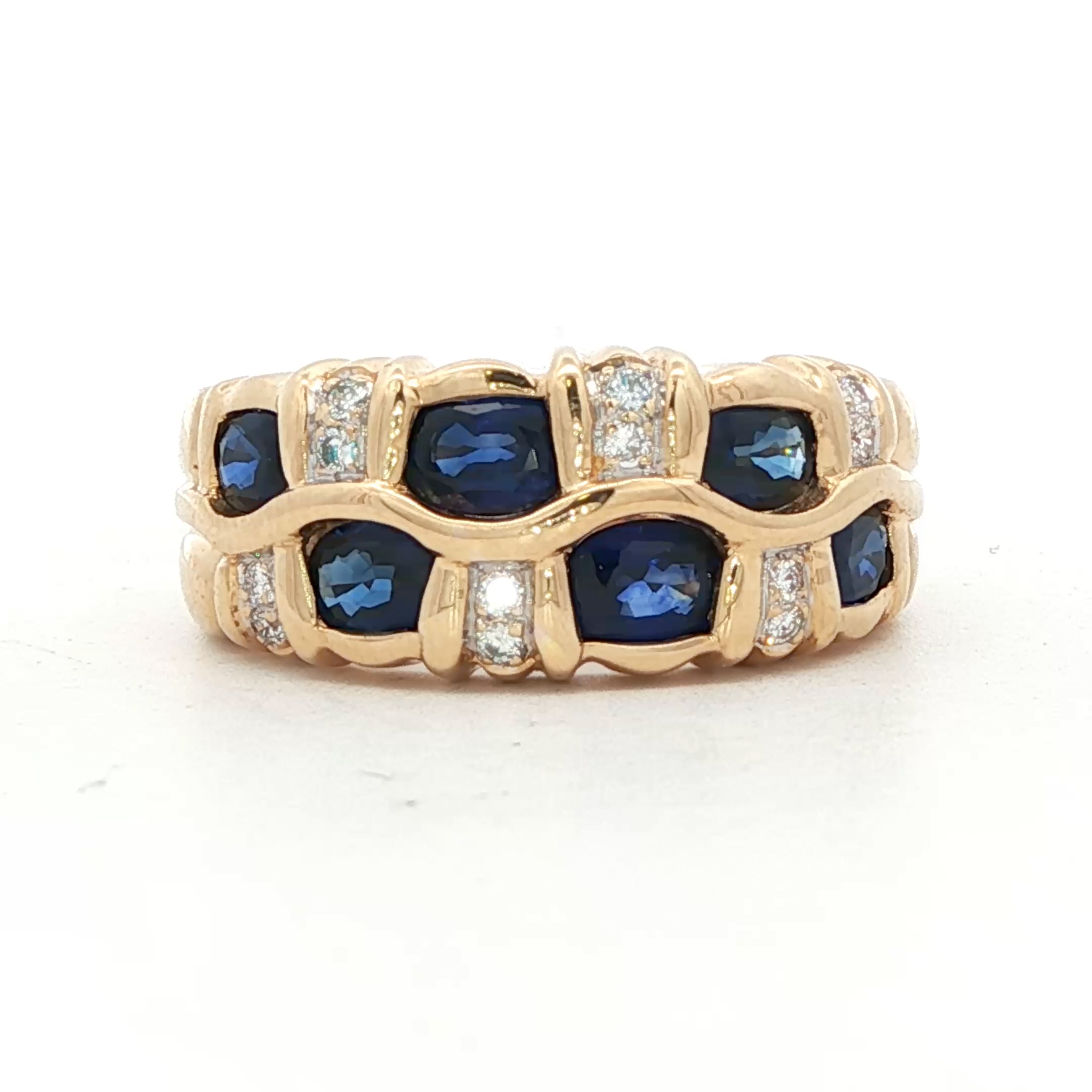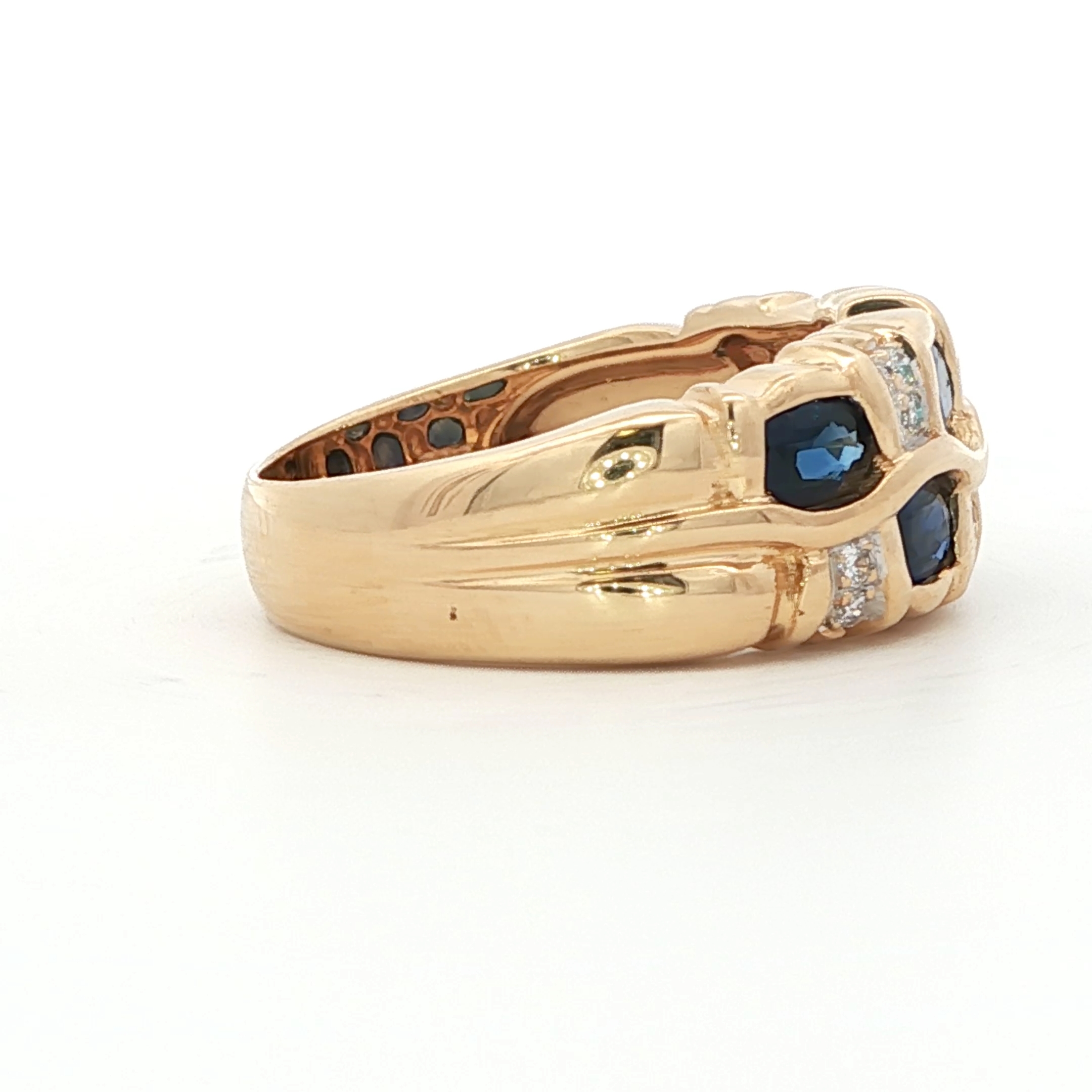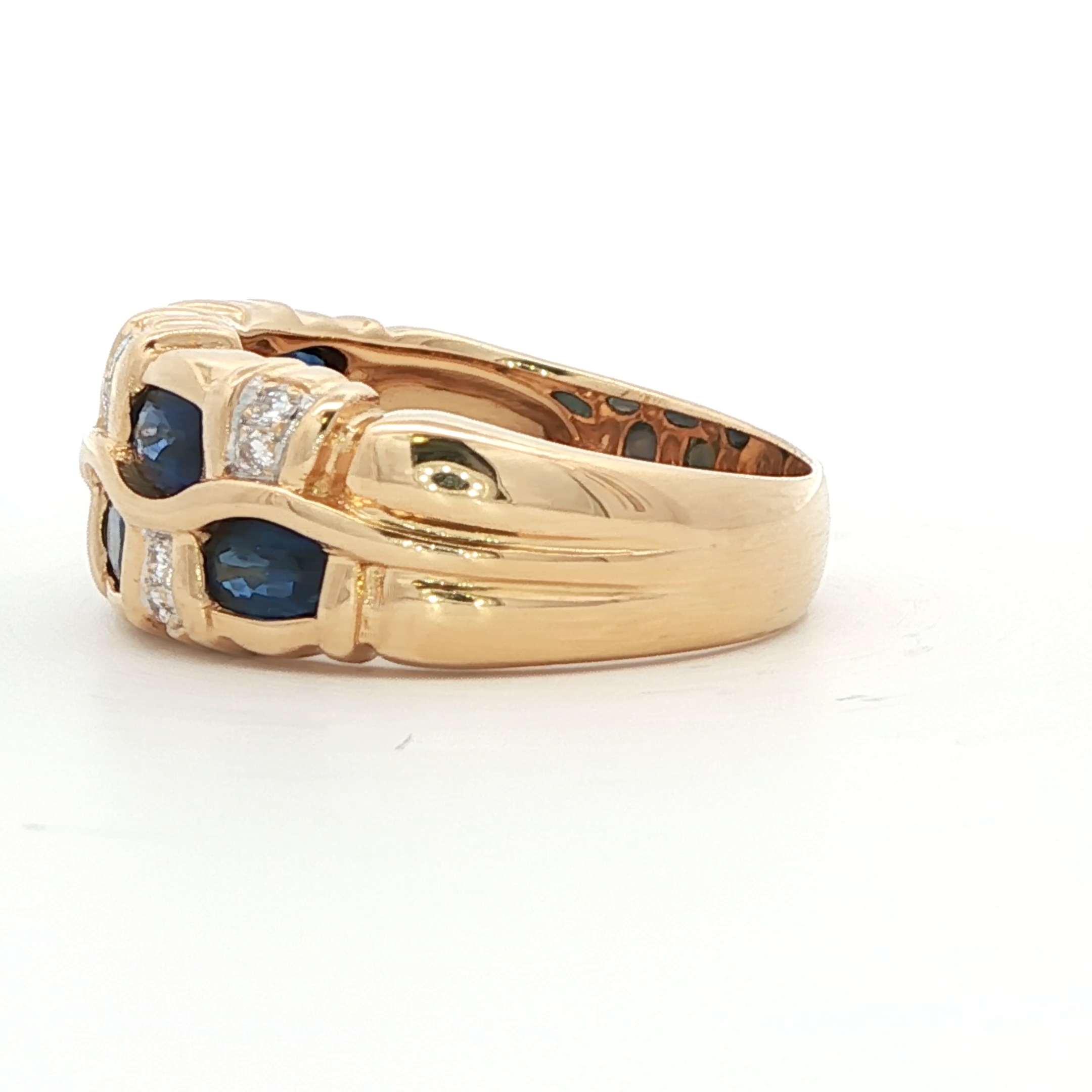 An elegant yellow gold ring featuring beautiful oval cut blue sapphires with a rich blue hue accompanied by dazzling round brilliant diamonds. The ring exhibits excellent polish and symmetry, with gems showcasing a sophisticated mixed cutting style that enhances their brilliance and transparency. This timeless design combines high-quality composition with professional craftsmanship for a refined aesthetic.