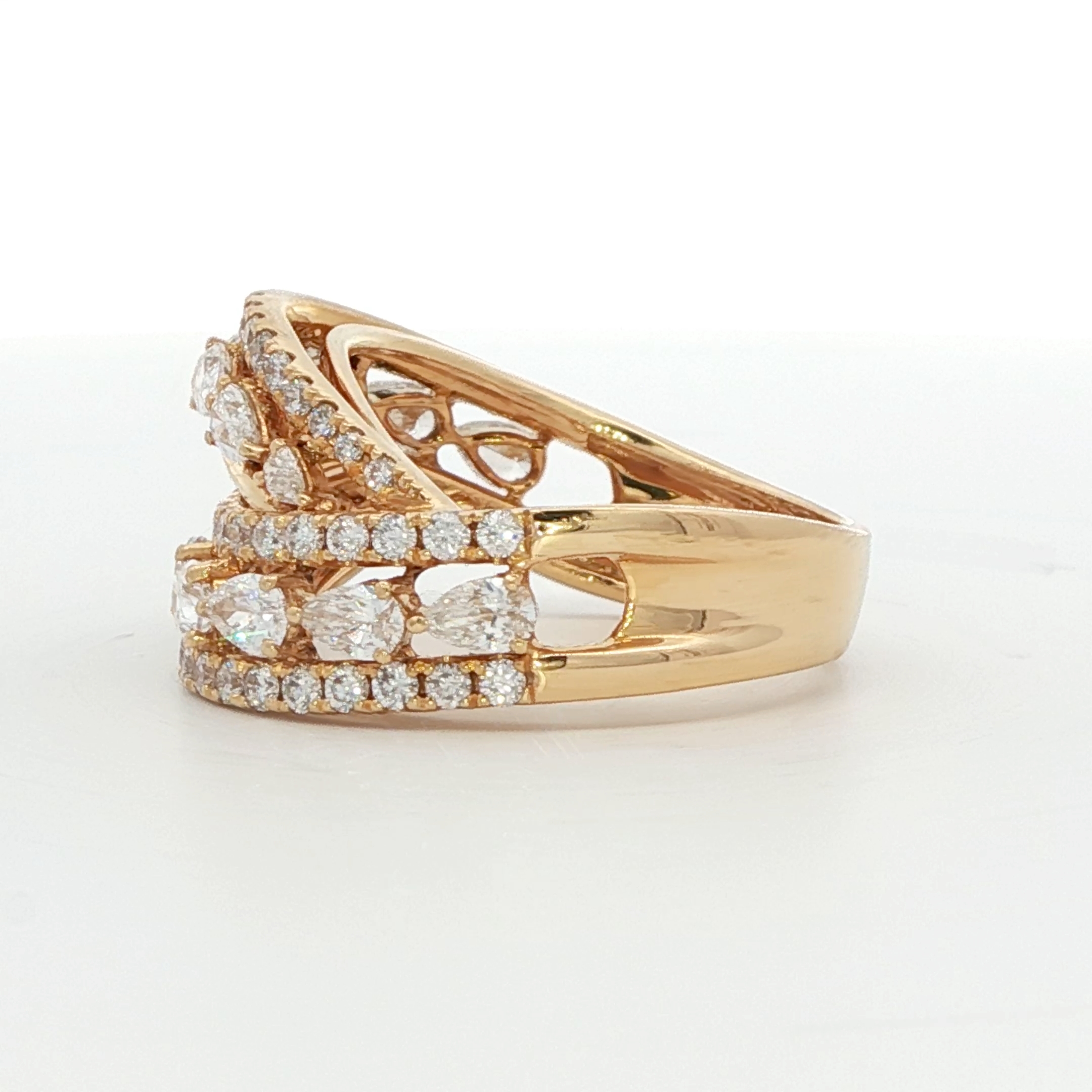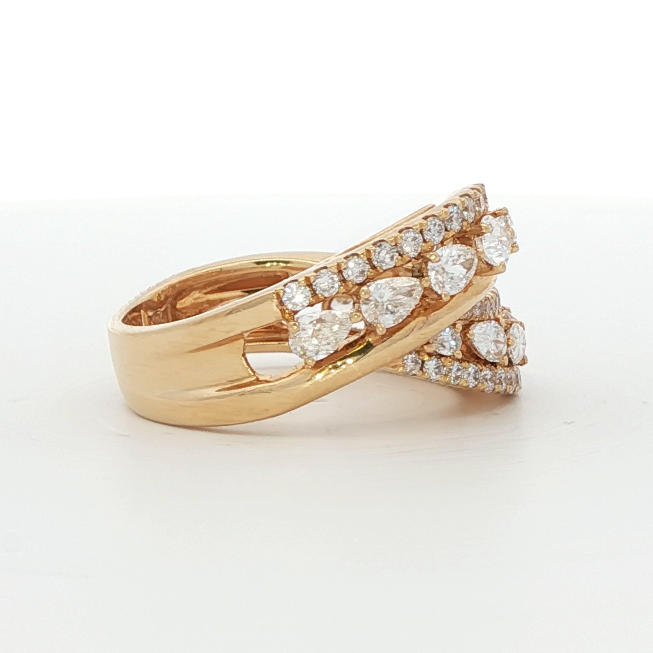 Indulge in the allure of this magnificent ring, crafted in radiant yellow gold. The ring features a dazzling array of pear cut and round diamonds set in a brilliant twisted style. This exquisitely designed ring embodies luxury, sophistication, and timeless elegance.
